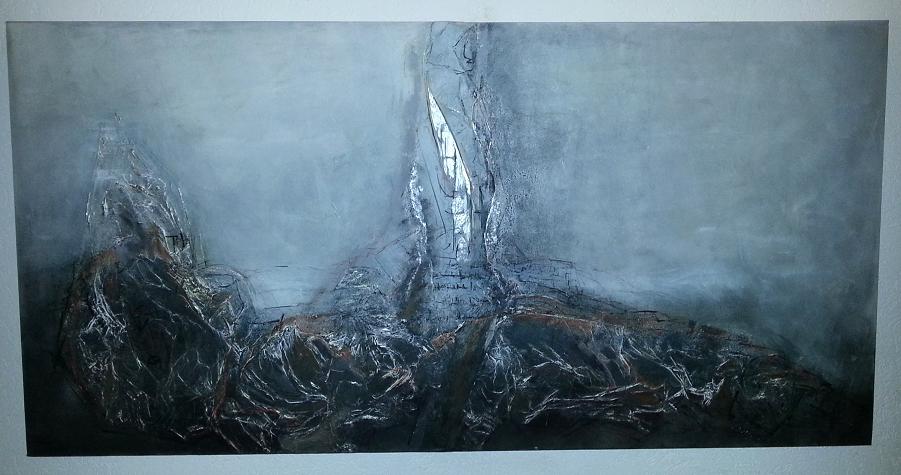 Gefällt mir sehr. Erinnert mich ein wenig an die Meerbilder von Turner. Der graue Himmel und unten die weiße Erhöhung. In der Mitte sehe ich eine Eisscholle, die viel Kraft hat. Malst du mit Oel oder Acryl? Sind das in der Mitte arabische Schriftzeichen oder ist das Struktur?