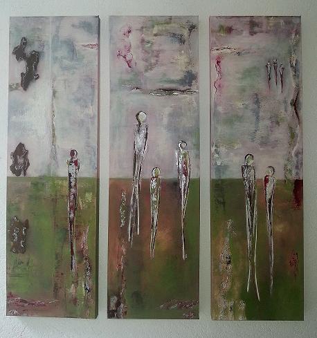 ich könnte mir zum beispiel auch denken, wie der erste teil am höchsten hängt und die beiden anderen teile entsprechend eine stufe tiefer ... sie haben ja jeweils einen horizont, und beim ersten teil reichen die köpfe der menschengestalten am höchsten in den himmel hinauf sozusagen, der zweite, mittlere teil auf der mittleren ebene wäre dann so eine art bewegliche zwischenwelt zwischen oberer und unterer sphäre, und der dritte teil würde die gebundenheit an die erde mehr betonen - nur so ein paar gedanken, die mir gerade kommen.